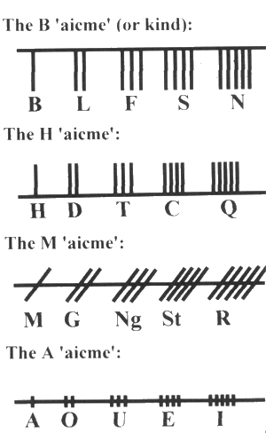 The Ogham alphabet is termed 'Beth-Luis Nion', from the name of the first, second and last letters of the first group. It basically consists of twenty letters divided into four groups of five each (the 5 forfeda letters were a later addition).