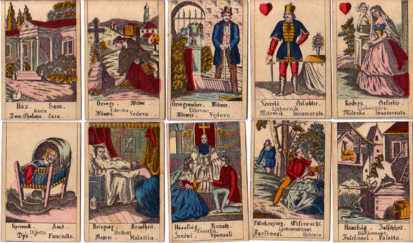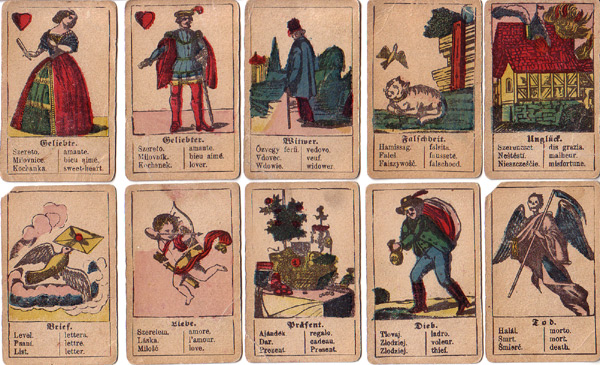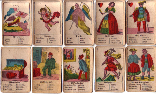 ![]() Historische Zigeunerkarten/Aufschlagkarten, 52 Blatt, schablonenkoloriert | Herst. Hegeneauer, Wien um 1880 |