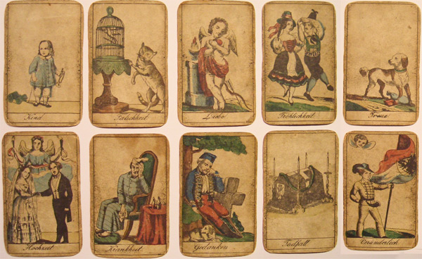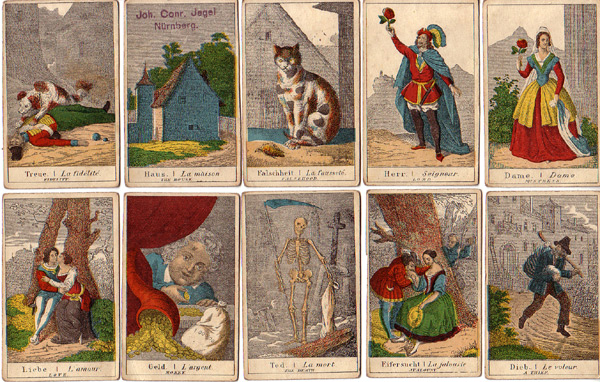 ![]() Wahrsage-Kartenspiel mit zweierlei Bedeutungen (richtig und umgekehrt liegend), Kupferstich, handkoloriert um 1820 |